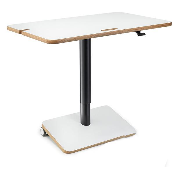 Skrivbordet är höj- och sänkbart genom gasfjädring och har måtten 60x100cm. I nederkant sitter en platta som stöd för fötterna och under plattan sitter hjul som gör bordet lätt att flytta på.